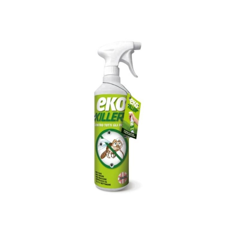 Ekokiller è un insetticida antiparassitario ad ampio spettro di azione in emulsione acquosa, efficace per molte settimane. Ekokiller agisce sia per contatto che per ingestione contro ogni insetto a sangue freddo sia strisciante che volante. Efficace contro tarme, acari, pulci, mosche, cimici, formiche, zanzare, scarafaggi e tarli. Inodore, incolore, non unge.